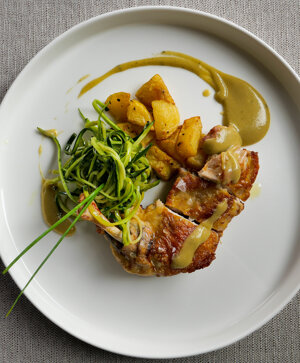 Bianco di pollo al curry madras con tortino di riso basmati